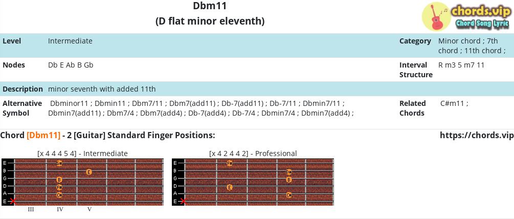 Tìm hiểu Hợp âm guitar/ukulele: Dbm11 - D flat minor eleventh - minor seventh with added 11th - Các note cấu thành: Db E Ab B Gb - Cấu trúc quãng: R m3 5 m7 11