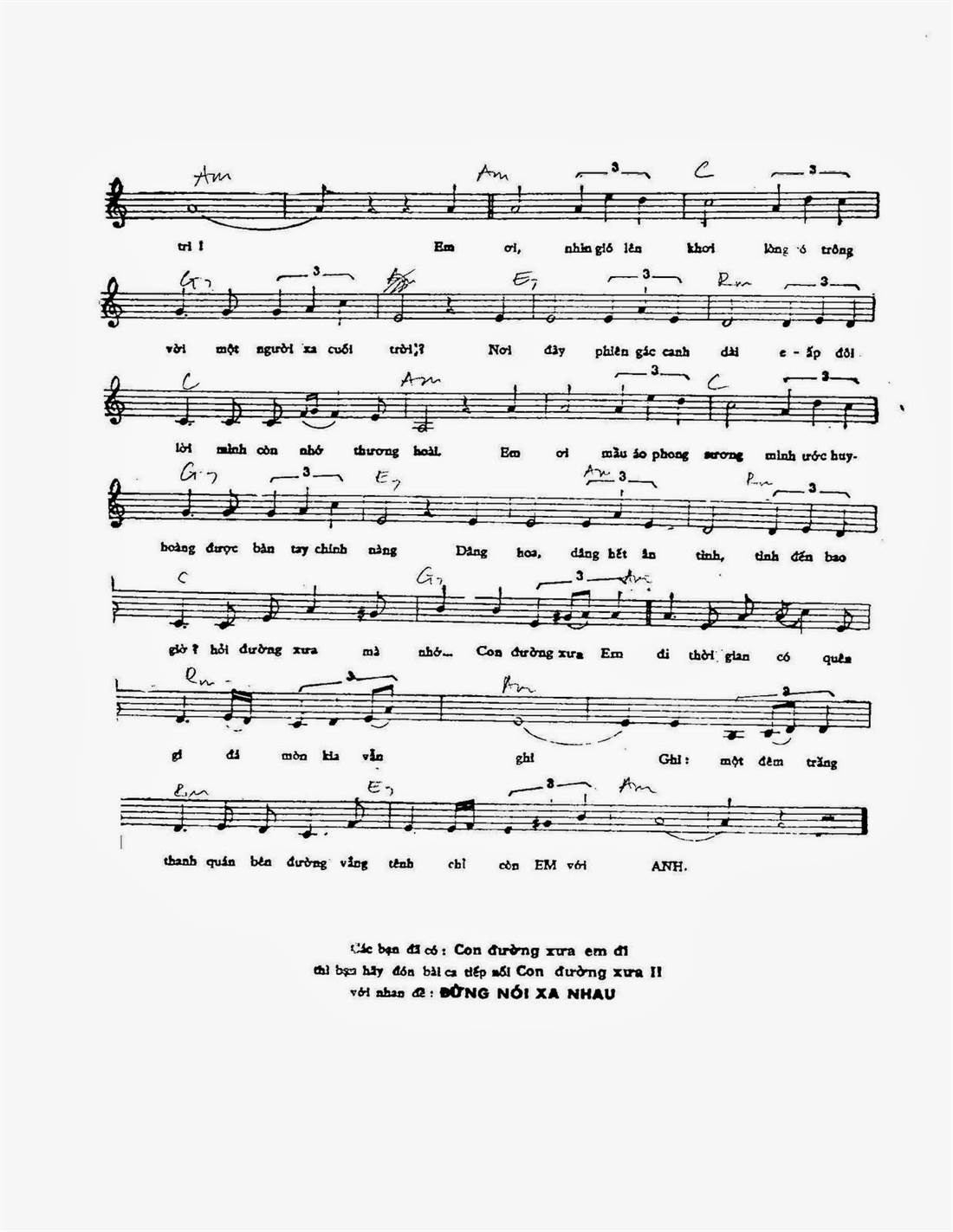 Sheet music, node, guitar pro tabs song: Con đường xưa em đi - (1. Con đường xưa em [Am] đi vàng lên mái tóc [Dm] thề ngõ hồ...)